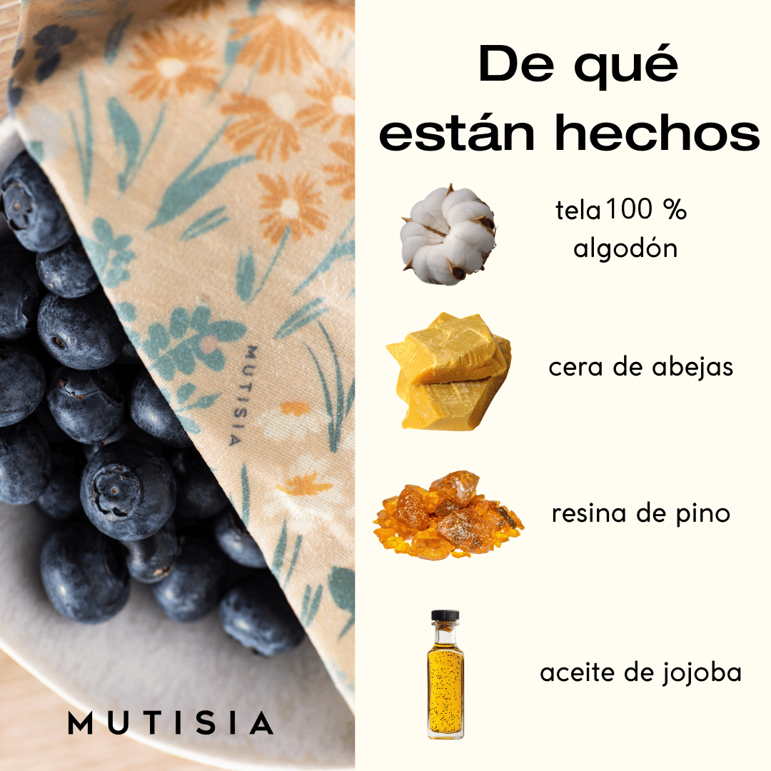 Tela de algodón, cera de abejas, resina de pino y aceite de jojoba